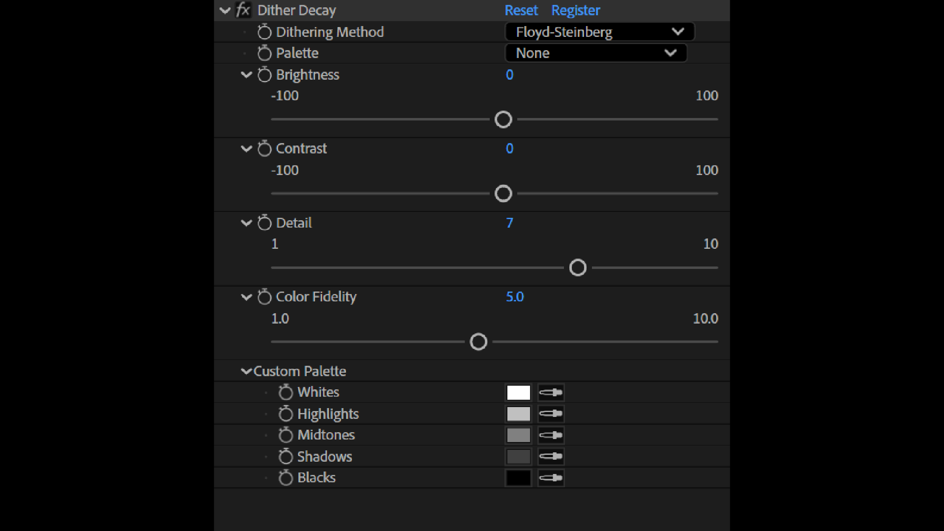 Dither Decay gives you incredible control over how your footage is processed. Set the detail low for a gnarly pixelated effect or set it high for a subtle textural wash.